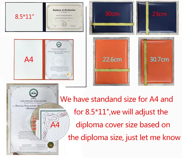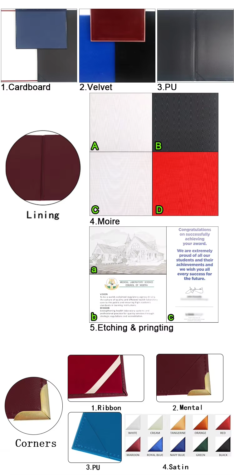 ● Options de personnalisation:Notre titulaire de certificat prend en charge la personnalisation complète, y compris les logos imprimés, les motifs en relief et les dispositions internes sur mesure pour s'adapter aux certificats uniques ou multiples. Vous pouvez choisir parmi une gamme de couleurs, de matériaux et de finitions pour correspondre à votre identité de marque. Nous fournissons également des ajustements de taille pour assurer une compatibilité parfaite avec vos dimensions de document.